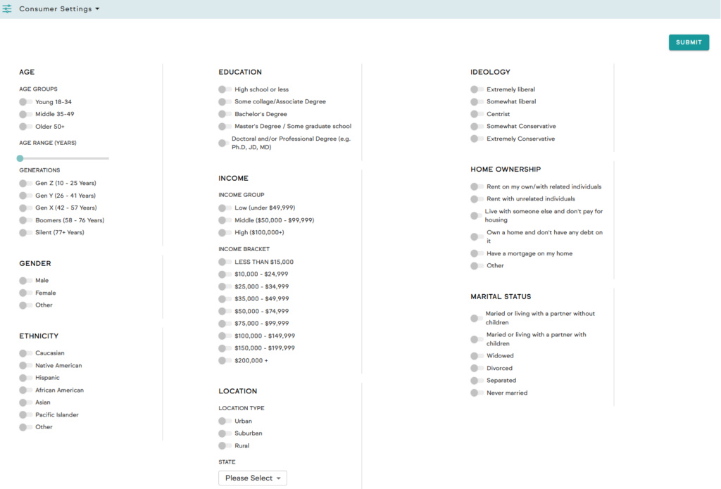 - Filter by age, income, education, ideology, gender, location, and more